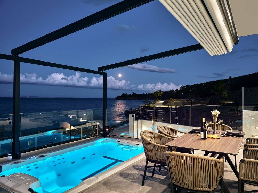 The Villa’s front veranda features a spectacular 4m x 2.30m Swim Spa, which, combined with the amazing view of the Ionian Sea, offers a unique relaxation! A Swim Spa combines the best features of a Spa and a swimming pool, essentially allowing you to swim against a continuous stream of water – you will never need to turn around, as one does in a swimming pool.