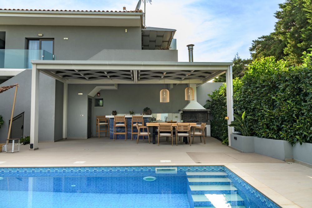 Each suite offers privacy and has its own heated swimming pool, Jacuzzi, BBQ, outdoor dining area, as well as outdoor shower, sunbeds, parasols and a pool bar with a refrigerator. The fenced outdoor spaces are ideal for families with children. Also, the transport from and to the airport/port is offered free of charge for bookings of 7 or more nights.
