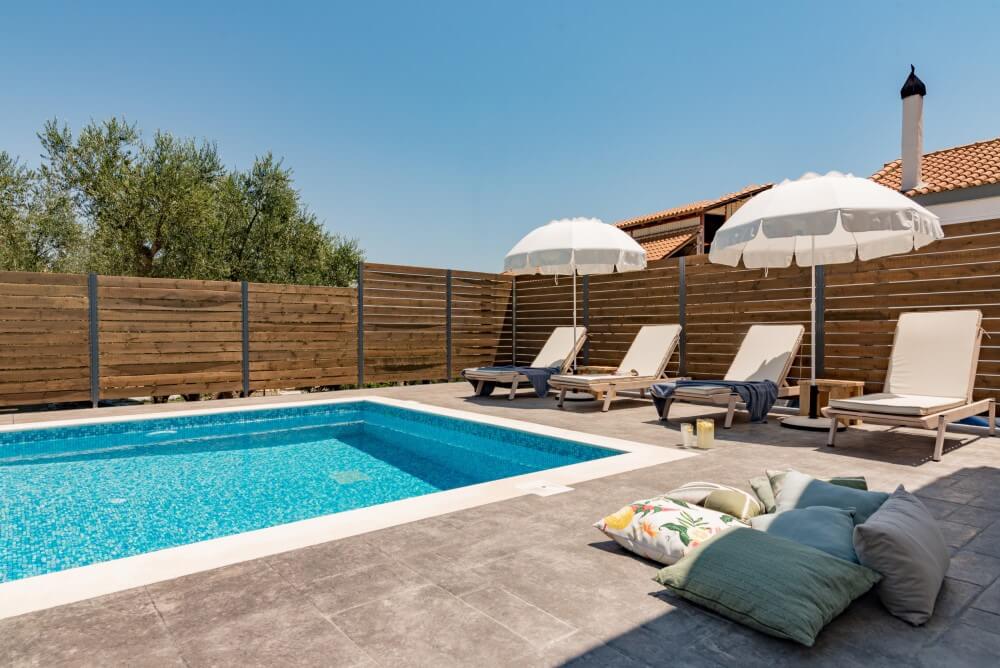 On the ground floor, the guests will find the stylishly decorated living room, the dining area and the fully equipped kitchen. One bedroom is located on this floor; it has access to the swimming pool, is equipped with two single beds that can be combined into a queen-sized one and has a bathroom with a shower. On the first floor, the guests will find the other two bedrooms, which feature a queen-sized bed and two single ones that can be combined into a queen-sized one, respectively. They both have access to a bathroom with a shower and to a furnished balcony with a view of the swimming pool. The outdoor spaces are private, furnished and relaxing. They feature a built BBQ and a spectacular swimming pool – it is the perfect place to unwind and to enjoy a cocktail in the sunset!