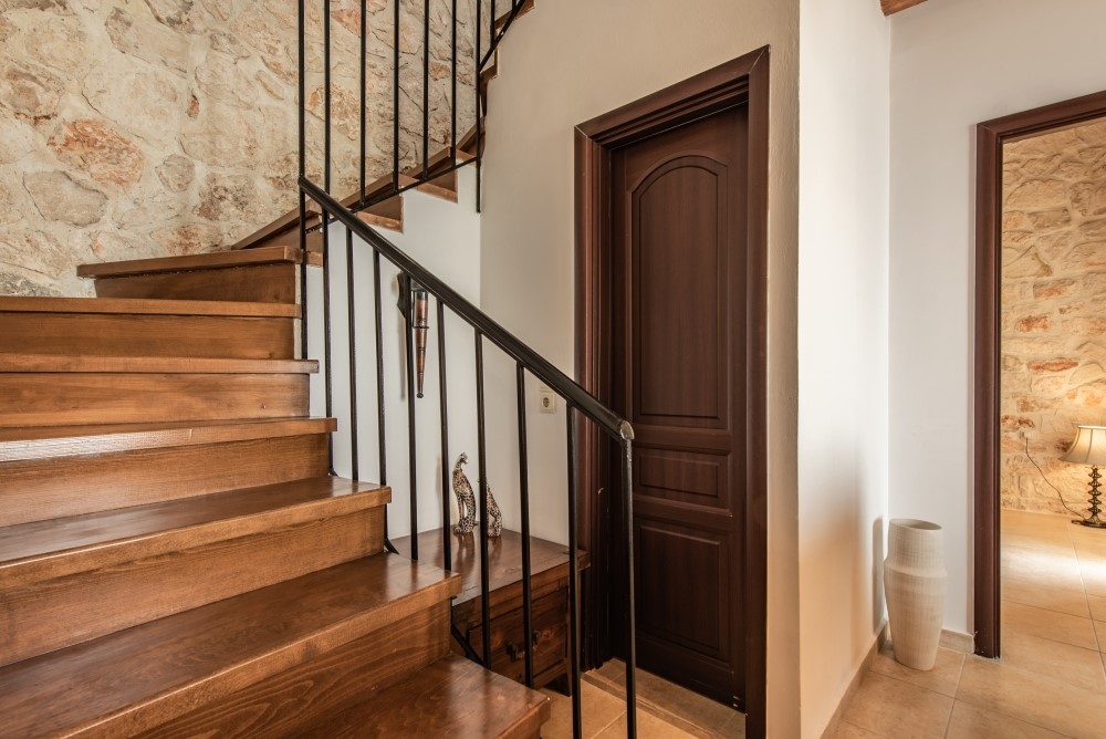 Murtini Villa is a spacious two-storied maisonette, measuring 100 sq.m. in total and sleeping up to 6 persons. The impressive interior has a strong traditional character, with stone walls and fine furniture made of quality wood. The ground floor features the fully equipped modern kitchen, the dining area and the living room, where the guests will find two comfortable sofas and a fireplace! Moreover, the living room has a veranda with a direct access to the swimming pool. The ground floor also features a small WC with a shower, as well as a bedroom with a double bed and a private veranda – that has a direct access to the swimming pool as well!